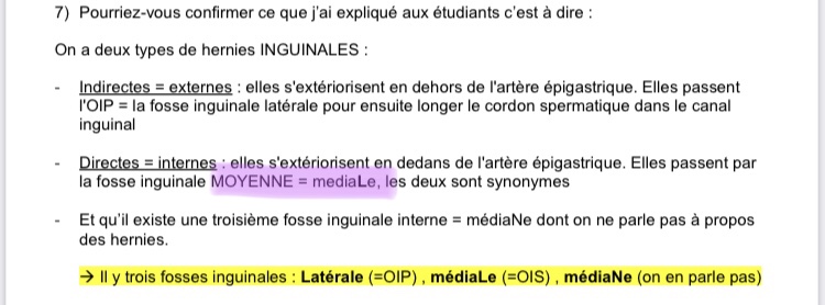 En effet, il dit qu’on ne parle pas des hernies mediaNes alors que dans la vidéo saison 6 épisode 3 à 11min48, ce sont bien les hernies de l’oblique interne/directe qui sont je cite « dans la fossette inguinale mediaNe, qui correspond au fascia transversalis mais en dedans de l’artère épigastrique ». (Dans la ronéo c’est bien écrit à travers la fossette inguinale médiane d’ailleurs, et il n’y a pas de correction la dessus dans les erratas 🧐)