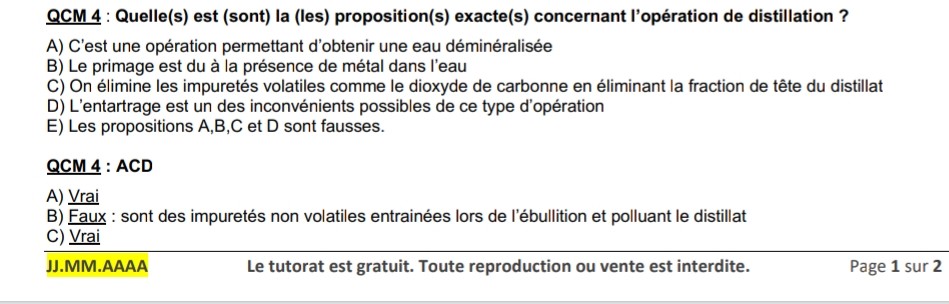 Hello!! Mmmh euh alors je te remets le cours ci dessous: c. Impuretés volatiles : Le CO2 ou NH3 existent dans l’eau à distiller ou sont apportées par l’atmosphère. Pour remédier à cet état, on a le choix entre : • Faire un dégazage de l’eau (chauffage) • Éliminer la fraction de tête (1er volume d’eau distillé) • Éliminer l’oxygène par barbotage de l’eau dans l’azote Donc je le compterais bien vrai
