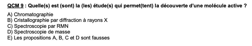 L'énoncé demandait : "permettant la découverte d'une molécule active" alors que tous les items rentrent en jeu concernant l'établissement de la structure d'un composé