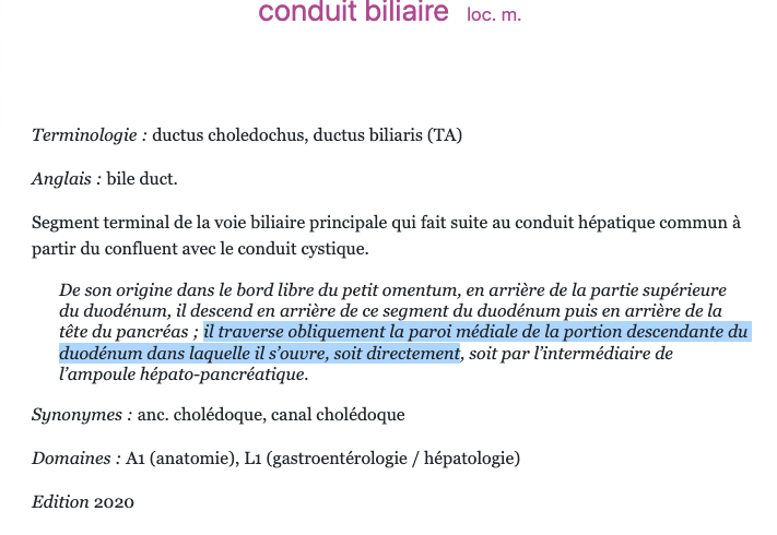 En réalité ton cholédoque certes s’abouche dans le D2 mais il le fait en passant dans la tête du pancréas et par derrière. Visible body est ton ami