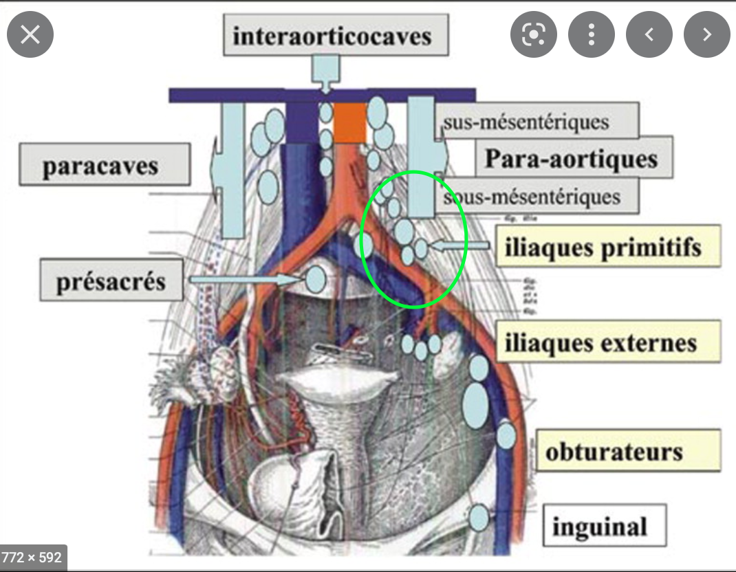 :arrow: Les noeuds lymphatiques iliaques primitifs sont situés aux alentours des vaisseaux iliaques communs