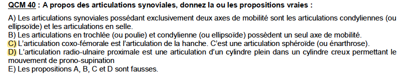 En effet, dans le cours sur le membre supérieur, il est dit que l'articulation huméro-radiale est une sphéroïde possédant 2 axes de mobilité seulement. Dans un QCM de ce type au concours faudrait-il le compter juste dans le cas général ou faux ?