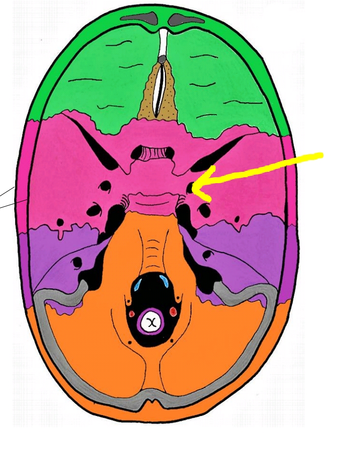 trou rond, comme on peut le voir sur une vue endocrânienne du crâne. (C'est à dire que l'on représente le crâne d'une vue supérieure comme si on avait retiré la voûte !) Je t'indique ici le