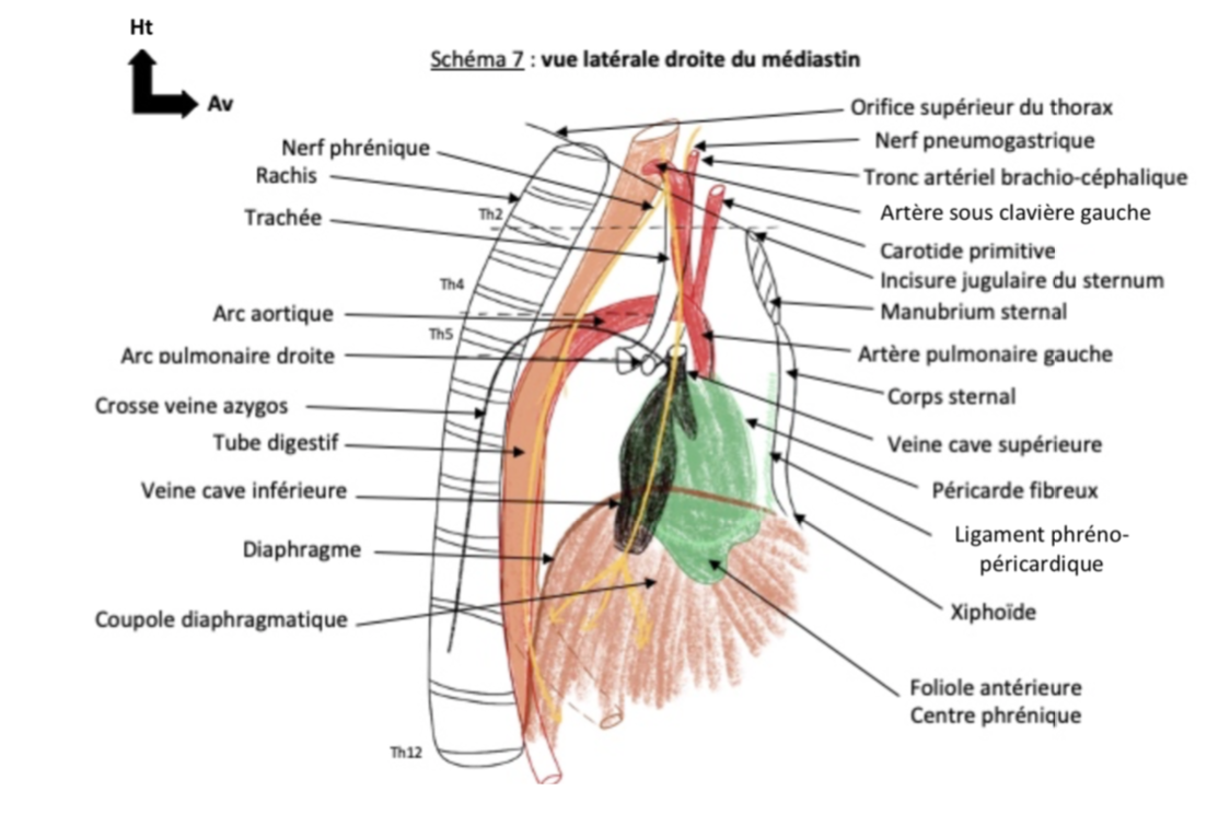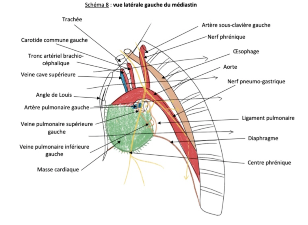- L'oesophage est très visible à droite, il cache donc l'aorte sur une vue latérale droite - L'aorte est très visible à gauche, elle cache l'oesophage sur une vue latérale gauche
