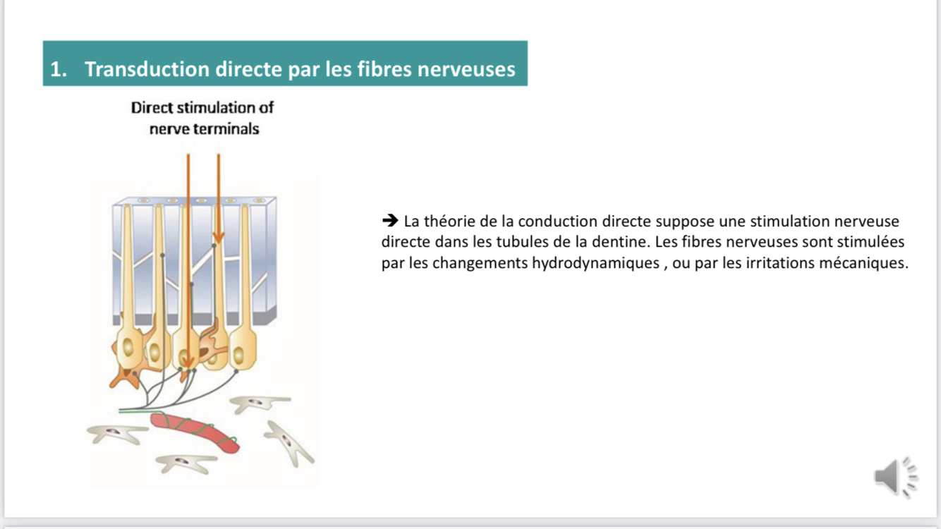 L’item d du qcm 4 est le suivant: « La théorie de la conduction directe suppose une stimulation nerveuse directe dans les tubules de la dentine ». J’ai fortement hésité mais je m’en suis tenu au cour et à la définition. Transduction signifie transformation du type de signal et conduction sont des phénomènes bien distincts. Il me semble que dans la fiche on ne parle que de transuction directe, n’est-ce pas?