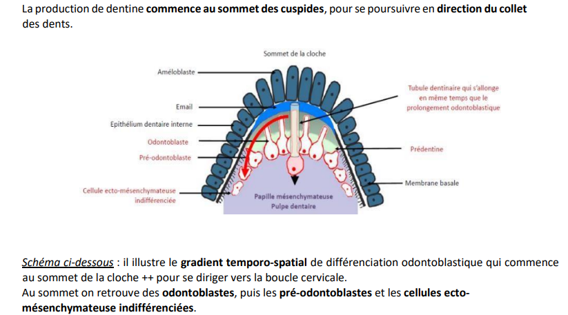 Je ne comprends pas pq cet item est compté juste : " Il est possible de retrouver au niveau de la pointe cuspidienne des odontoblastes, puis des pré-odontoblastes et des cellules ecto-mésenchymateuse indifférenciées au niveau du collet de la dent"