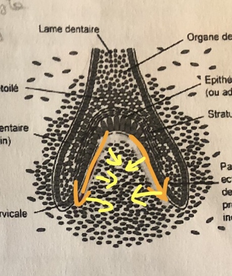 je mets des schéma pour illustrer mes propos: en orange la différenciation odontoblastique, en jaune la sécrétion de dentine selon ce que j'avais compris