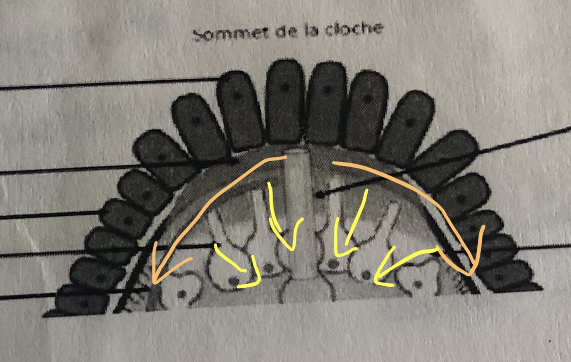alors que "la production de dentine commence au sommet des cuspides(=cloche) pour se poursuivre en direction du collet des dents", ici c'est une sécrétion vers le centre de la pulpe