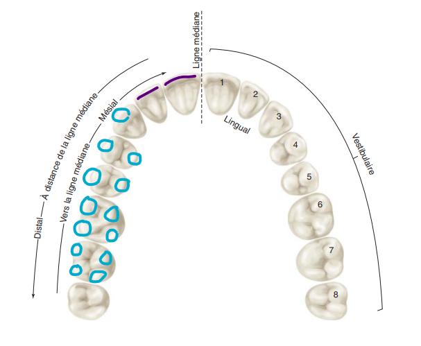 Pour les dents antérieures (incisives et canines), comme elles n’on pas de face occlusale mais plutôt un bord libre, on ne parlera pas de sillon ni de fosse.