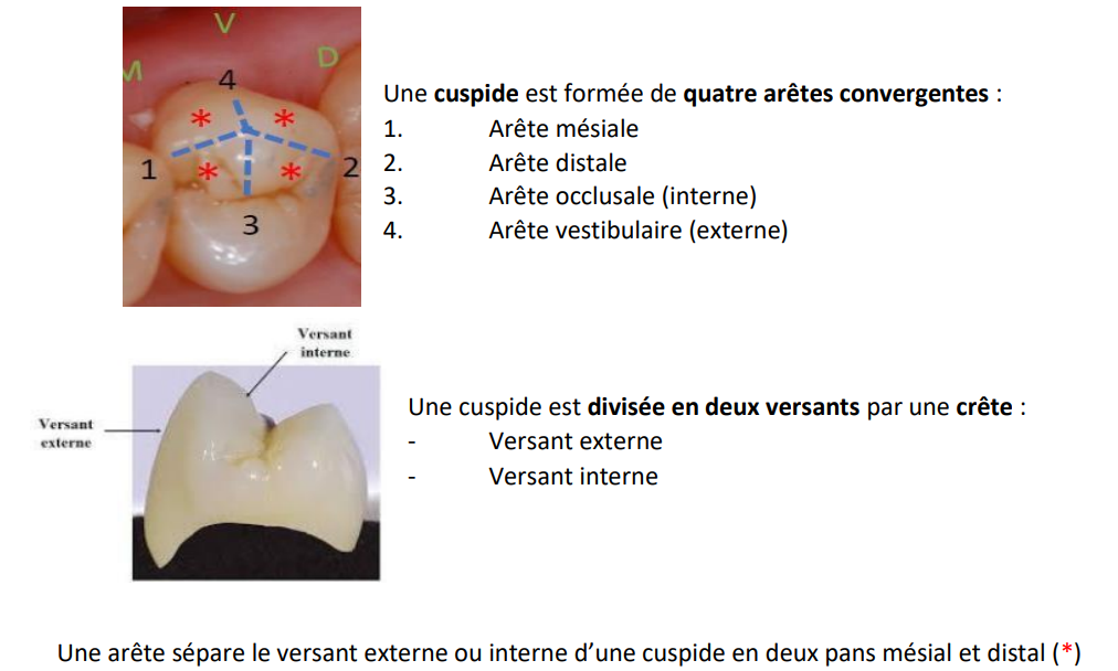Salut ! Svp je ne comprends pas trop cet item (si vous auriez un schéma schéma svp) "Une arête sépare deux pans mésial et distal d’un versant interne d’une cuspide".