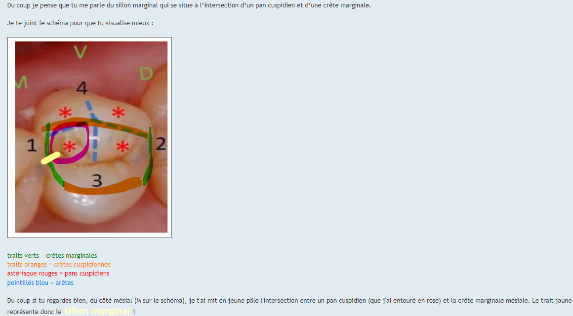 J'ai regardé la vidéo sur l'anatomie dentaire, si j'ai bien compris les fosses marginales sont un peu éloignées de la crête marginale, un peu plus vers le centre de la dent bien qu'elles soient à l'intersection du sillon central avec une crête marginale, et les sillons marginaux sont plus vers la crête marginale. C'est bien ca ou je me trompe?