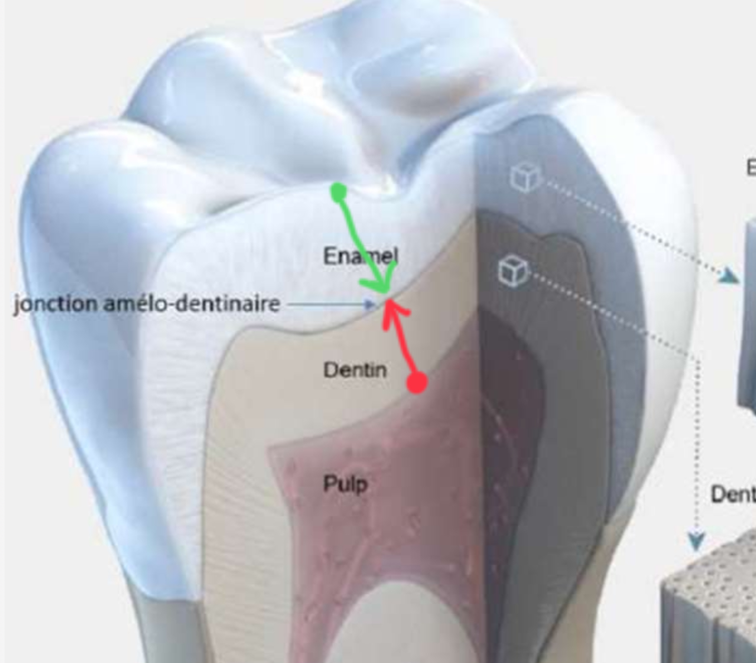 A savoir qu'avec le temps, les améloblastes reculent vers la surface (puis disparaissent, l'émail ne peut plus être formé) et pareil, les odontoblastes reculent en direction de la pulpe (ils sont bien à la surface de la pulpe mais c'est pour te donner la direction ; eux ne disparaissent pas, on peut reformer de la dentine).