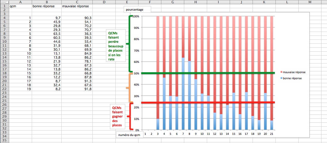 Je vous ai mis sur le graph trois seuils que j'ai fixé arbitrairement. Comme ça vous visualiserez mieux les QCMS qui font la différence (=ceux peu réussi et donc si vous les faites justes vous gagnez beaucoup de places) de ceux qui ne font pas la différence, mais qu'il ne faut pas rater car les autres ont bien réussi ^^.