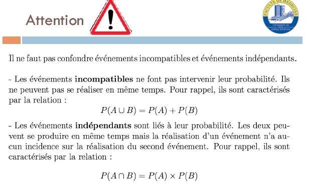En fait ne comprend pas trop ce que vous avez voulu dire par "des évènements incompatibles/indépendants ne font pas intervenir leur probabilité" ?