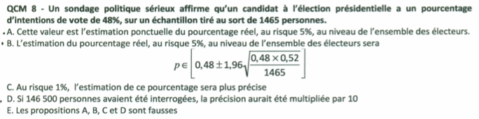 On te demande l'estimation du pourcentage au niveau de l'ensemble des lecteurs (-> population) au risque de 5% (-> e=1,96)