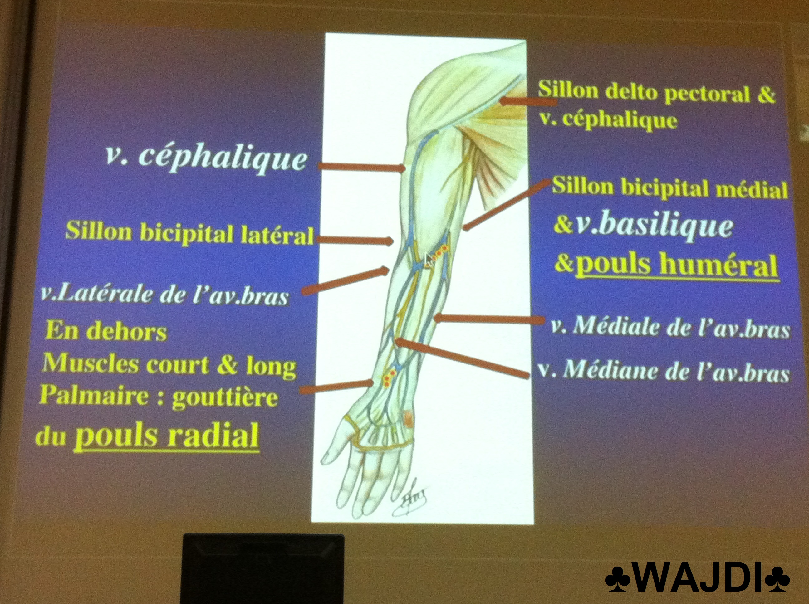 -en haut : 2 pointes = 2 veines -> la plus interne = veine basilique et la plus externe = veine céphalique