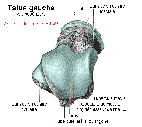 Voila une image du talus en vue supérieure pour te montrer qu'au niveau de son corps en vue supérieure on identifie bien un rail creux qui s'articule avec la facette articulaire tarsienne du tibia.
