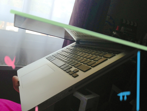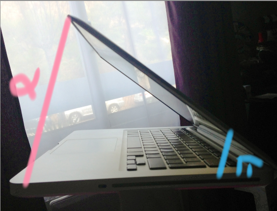 Si tu penches l'avant vers le bas = ta courbure ;) tu auras toujours ton angle plus grand donc si tu veux la partie sup dépassera toujours ta pointe mais ta pointe sera tout de même plus haute que ton corps vertébral c'est-à-dire que si tu mesurais la distance entre le sol et l'avant de ton ordi tu auras une plus petite distance qu'entre la pointe de ton ordi et le sol.