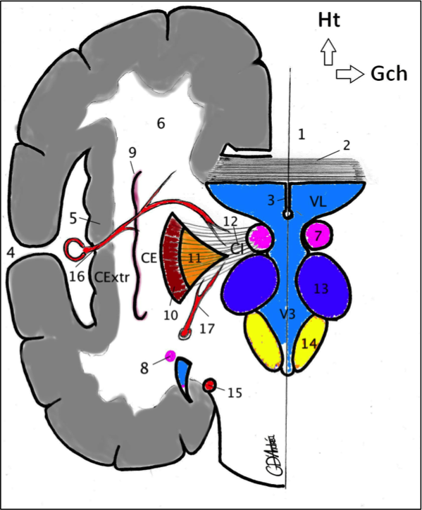 Concernant l'orifice inter-ventriculaire de Monroe, c'est ce qui fait le lien entre les ventricules latéraux et le V3 (tu les vois ici de part et d'autre du fornix justement ;)