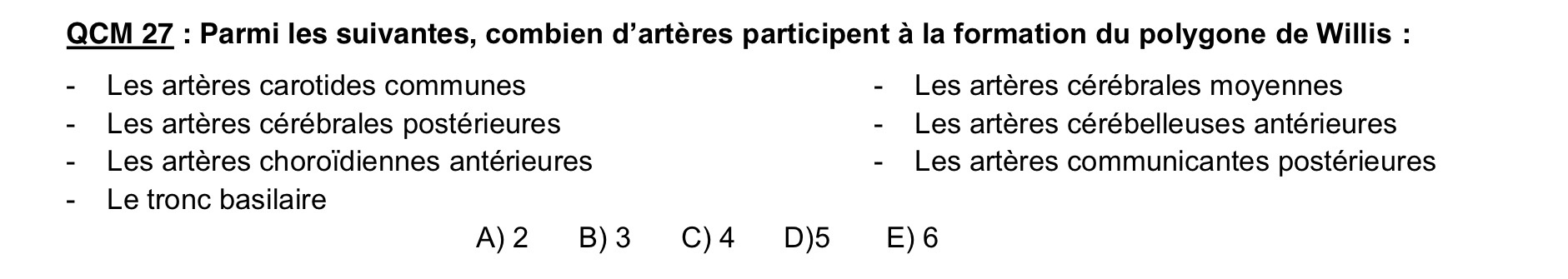 La réponse des Annatut est B, mais j'aurai plutôt dit la D vu qu'il y a 2 artères cérébrales postérieures et 2 artères communicantes postérieures, d'autant qu'il demande le nombre d'artère et pas le nombre d'item exact ^^'