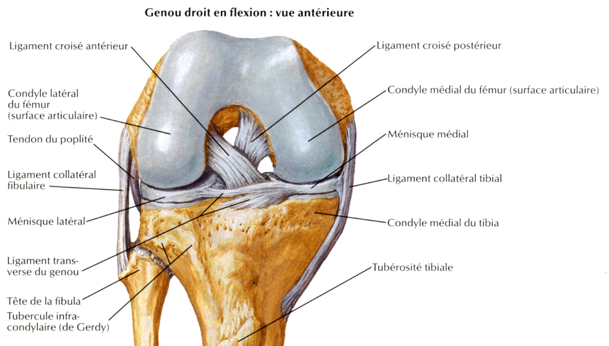 Voila une image ou tu vois les condyles fémoraux (pour être précis la surface articulaire apposée sur les condyles fémoraux) et les condyles tibiaux sur lesquels tu retrouves les surfaces articulaires