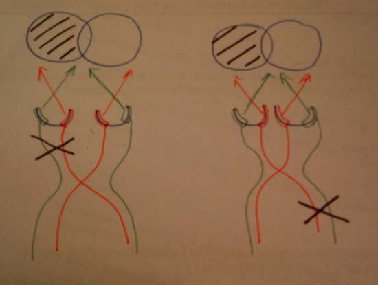 Pour moi la lésion du nerf optique gauche (ou perte de l'oeil gauche) a exactement les mêmes conséquences que la lésion du tractus optique droit :