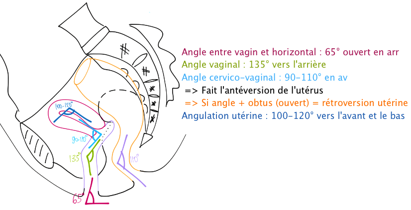 Tu vois bien les 2 angles : -Angle d'antéversion : entre le vagin et l'utérus -> l'utérus part en avant = antéversé -Angle d'antéflexion : l'utérus est recourbé sur lui-même -> il y a donc une flexion sur l'utérus lui-même = antéfléchi