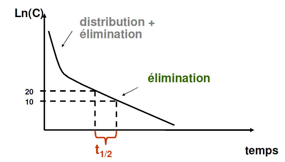 Si c'est bien en rapport avec les explications que je vous donne, pour calculer la demi-vie d'élimination, qui dépend donc de la constante d'élimination uniquement (bêta), il faut la calculer sur la deuxième partie de la courbe où seule l'élimination intervient ce qui semble logique. Sur cette deuxième partie de courbe on va déterminer le temps mis pour que la concentration soit divisée par 2 = demi-vie d'élimination.