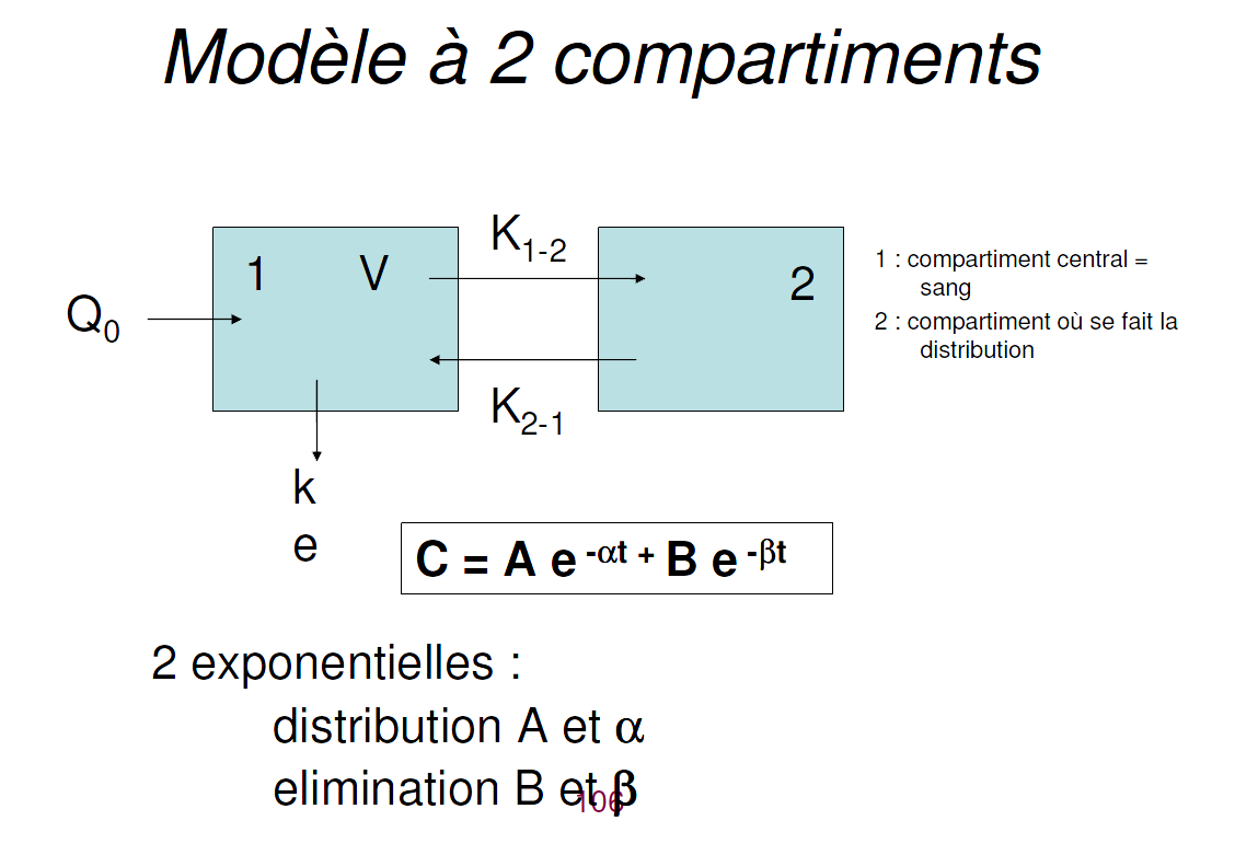 - On voit sur cette courbe que la décroissance de la concentration comprend deux phases : première phase, le médicament se distribue et s'élimine, donc la baisse de concentration est due à ces deux phénomènes --> intervention des constantes alpha et bêta
