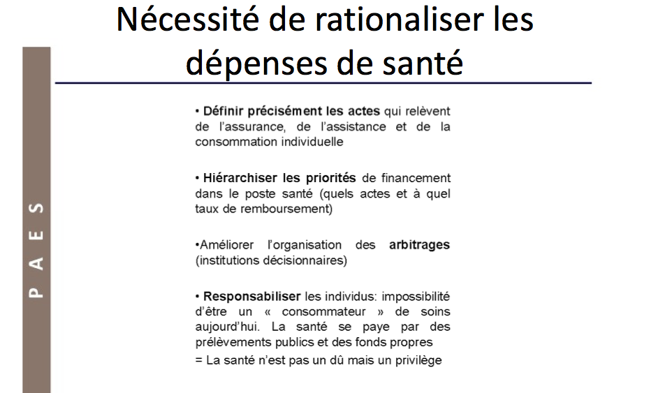 La diapo "rationaliser les dépenses de santé" montre les idées générales.