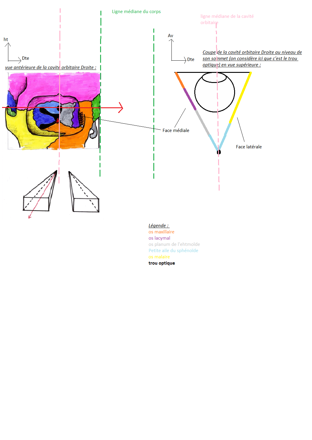 --> par contre si tu prends par exemple l'axe médian de ta cavité orbitaire (ligne pointillée rose) comme référence là t'auras l'ethmoïde qui devient alors EN DEDANS (=plus médial) de l'os lacrymal!! parcequ'il est plus proche de l'axe pris comme référence!