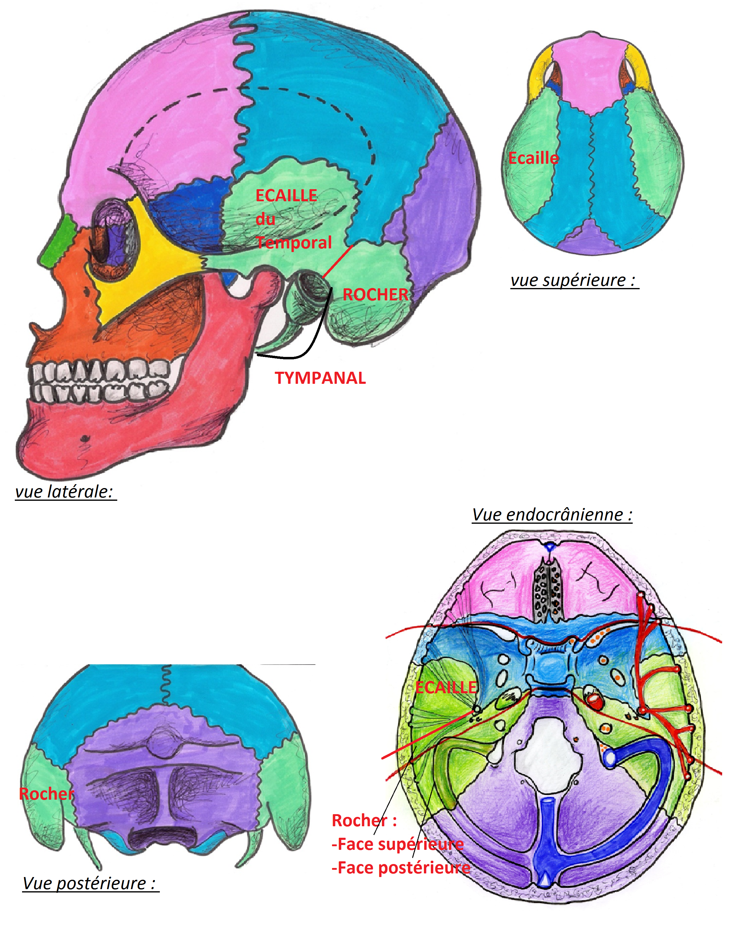 J'ai pas très très bien compris la différence entre l'écaille, le rocher, et le tympanal...^^ Y'a eu un QCM dessus y'a 2 ans, ou on disait que l'écaille s'articule pas avec l'occipital et le pariétal, du coup j'ai un peu de mal à visualiser tout ça ^^ !