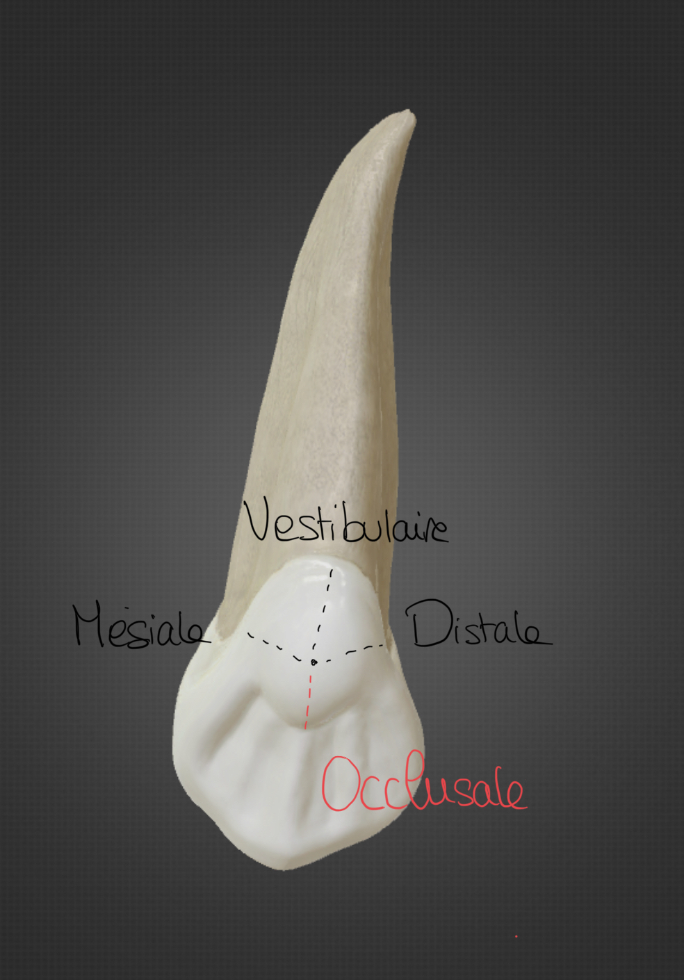 Canine (n°13) dans l'arcade maxillaire droite (entourée en rouge) : Arête occlusale de la canine (dessinée en rouge) : Pour te situer (et faire un petit rappel), je t'ai mis le nom des autres arrêtes.