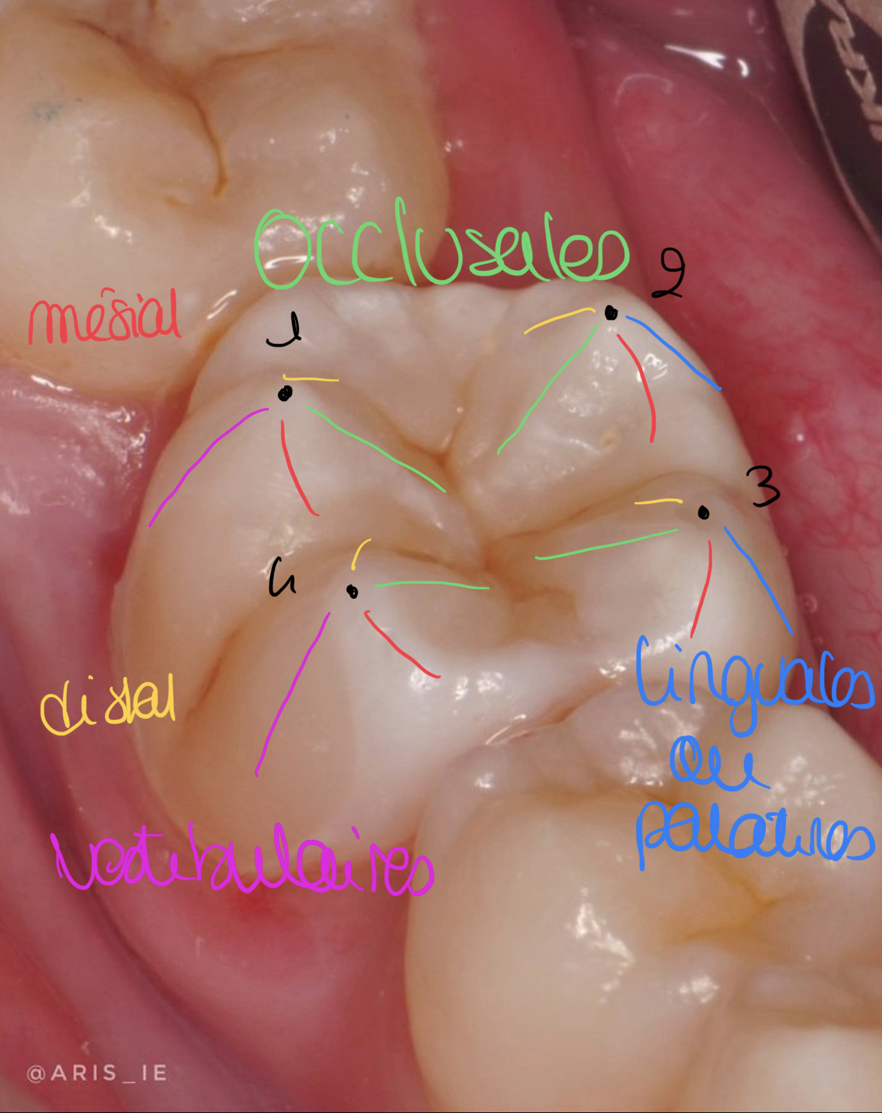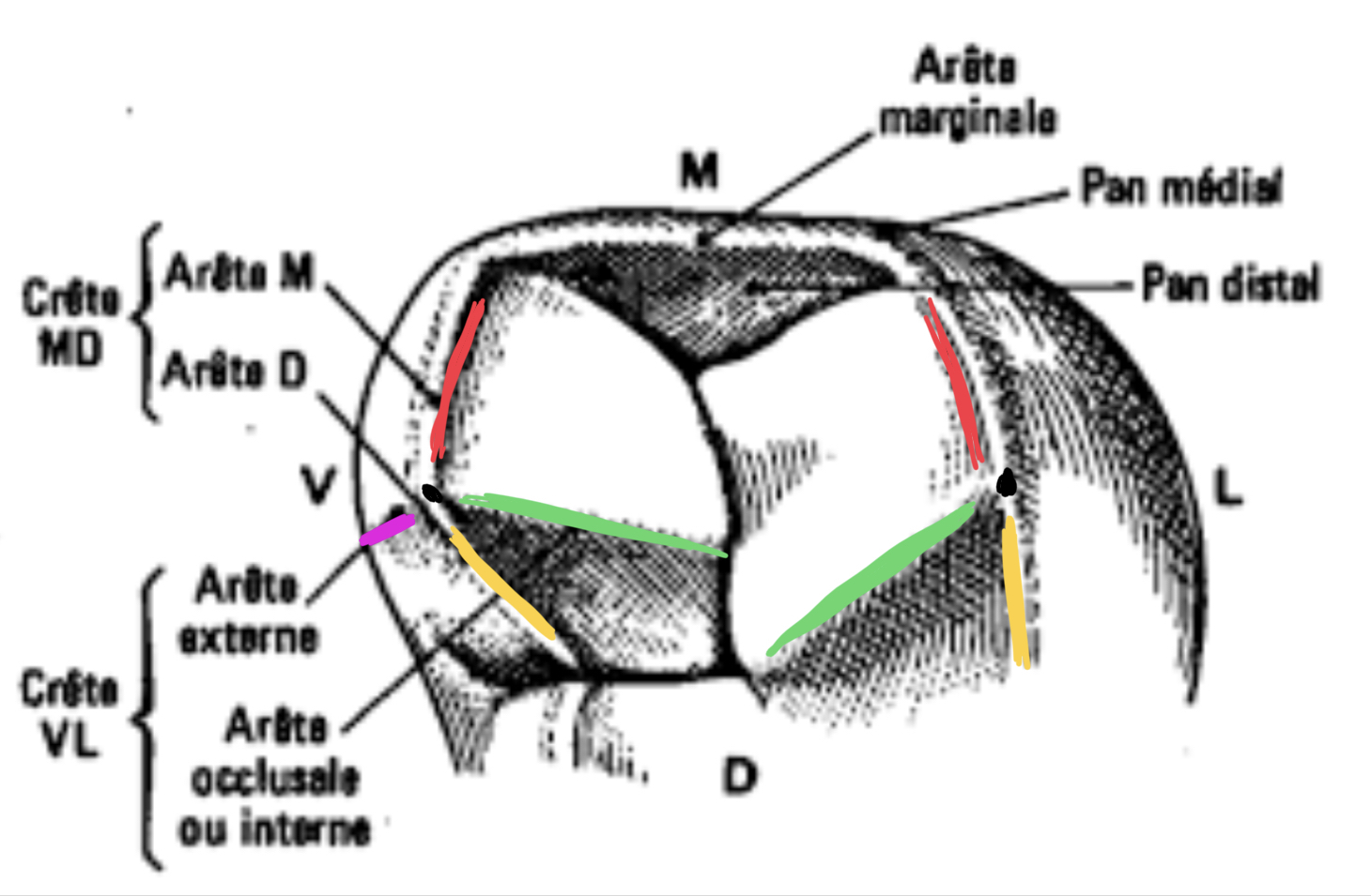 distinctes - arête vestibulaire (rose) --> arête externe- 1 arête occlusale (vert) --> arête interne - 1 arête mésiale (rouge)- 1 arête distale (orange) ___