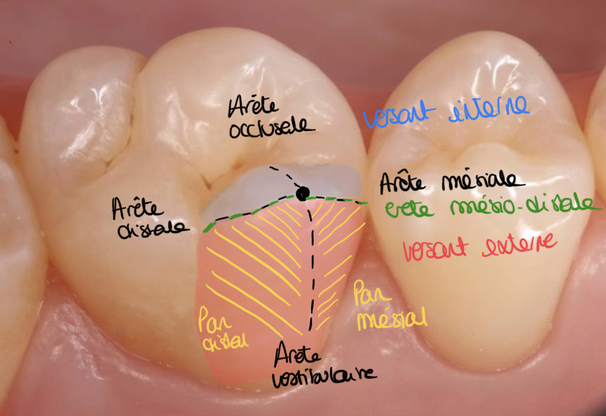 - Le versant externe, est donc divisé en deux pans par cette arrête vestibulaire (les pans sont dessinés en oranges : pan vestibulaire mesial et pan verstibulaire distal)