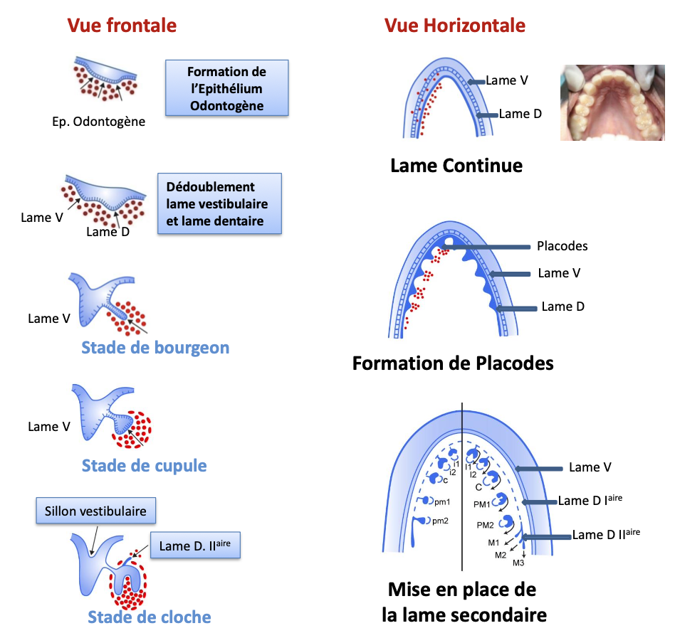 :arrow: Épithélium odontogène > lame dentaire (> germes > dents) + vestibulaire (> apoptose > vestibule)