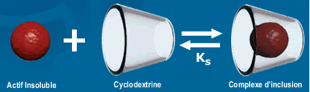 Donc du côté extérieur, les groupements hydroxydes sont toujours là, ce qui fait que ça reste une molécule très hydrophile, qu'elle contienne ou non une autre molécule dans sa cavité. Ainsi elle va pouvoir la transporter (phénomène de complexation), et augmenter sa solubilité alors qu'à la base la moléucle était très hydrophobe --> principe d'un adjuvant !