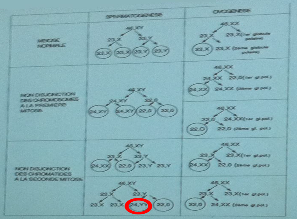 Comme on le voit sur ce schéma, une mauvaise disjonction des chromatides lors de la 2e méiose pourra conduire à un spermatozoïde 24,YY.