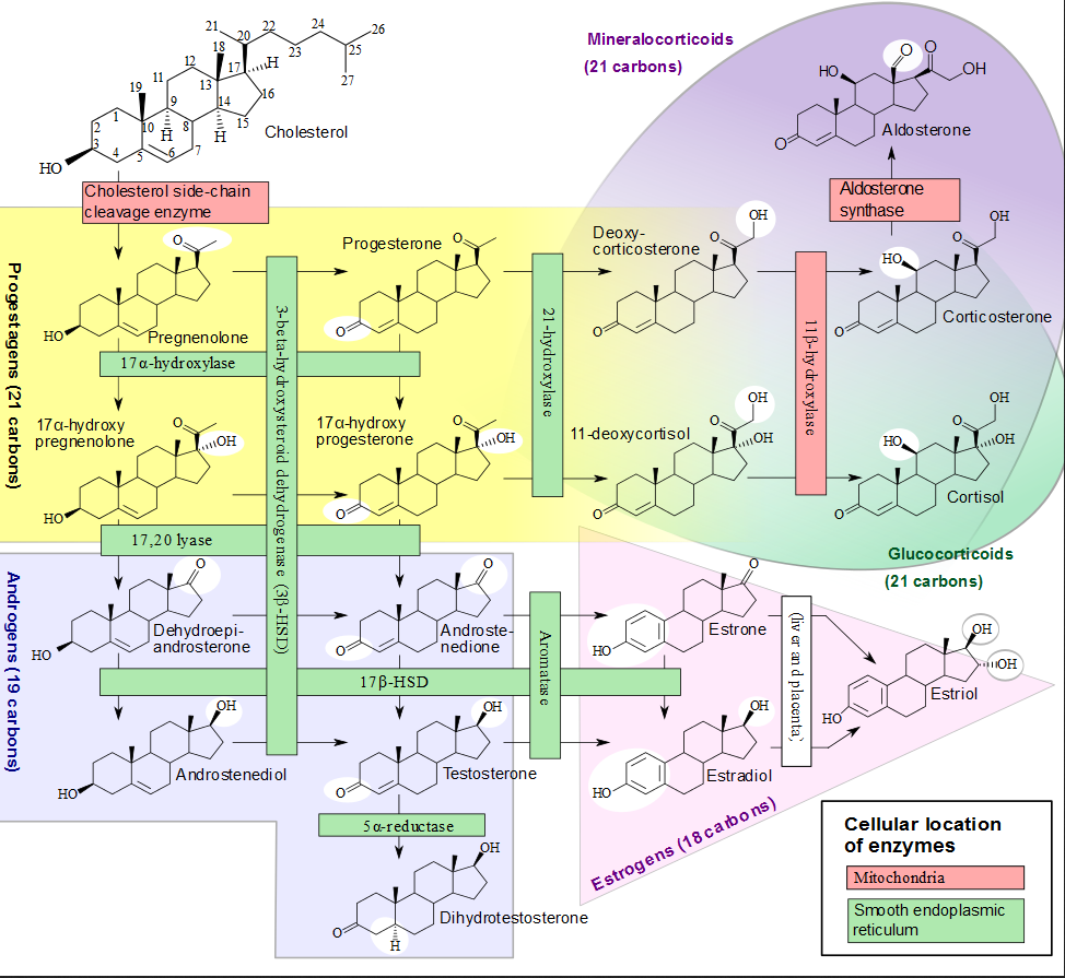 Déjà, qu’est-ce que la stéroïdogénèse ? C’est l’ensemble des réactions qui permettront de faire des stéroïdes (androgènes, oestrogènes, corticoïdes…).