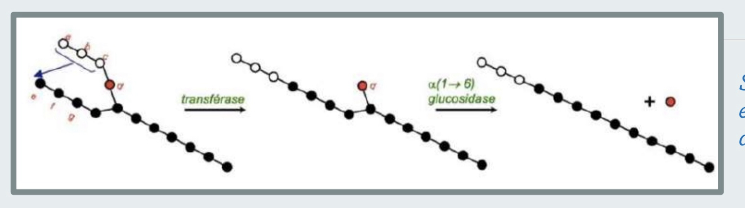 ,Dans la fiche sur la glycogénolyse on nous dit que l’enzyme débranchante va permettre de la déramification du glycogène, et sur le schéma affiché (cf photo) on voit qu’il ne reste plus qu’une molécule linéaire.