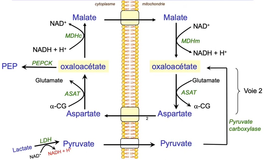 Je comprend pas trop pourquoi dans la fiche on dit L’OAA, pour équilibrer le système, redonnera également du MALATE via la MDHc (avec réduction d’un NAD+ cytoplasmique car quand on fait OAA----> Malate on a du NADH+H+----->NAD+ donc une oxydation du NADH+H+