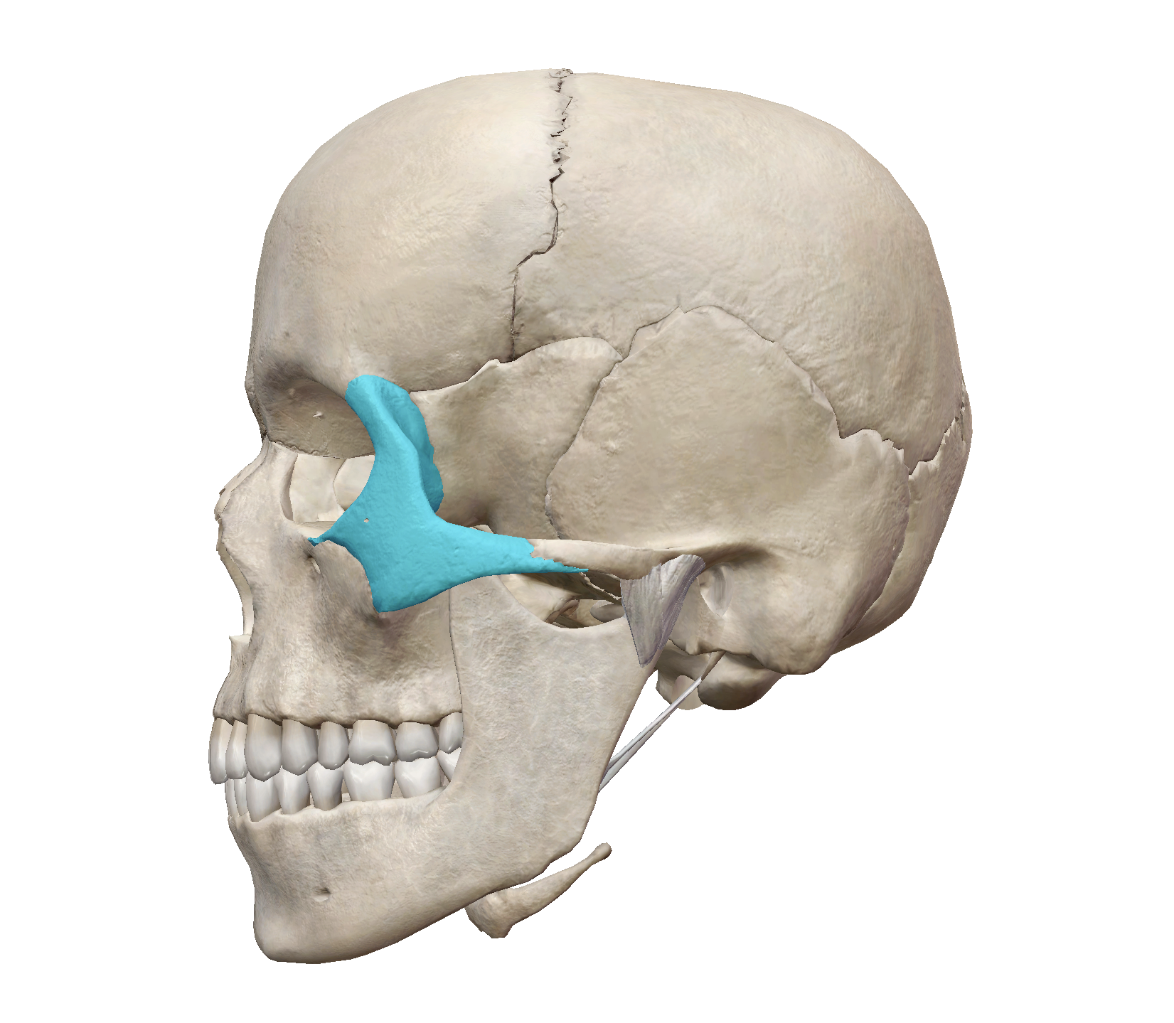 Sur cette image identique à la tienne sans numérotation, on aperçoit l'os zygomatique qui s'articule avec le processus zygomatique de l'os temporal. En arrière de l'os zygomatique, on retrouve l'os sphénoïde.