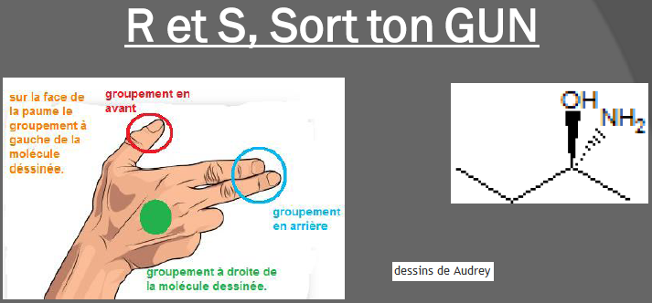Le groupement située à droite, ici CH3, de la molécule est sur le côté droit de ma main.