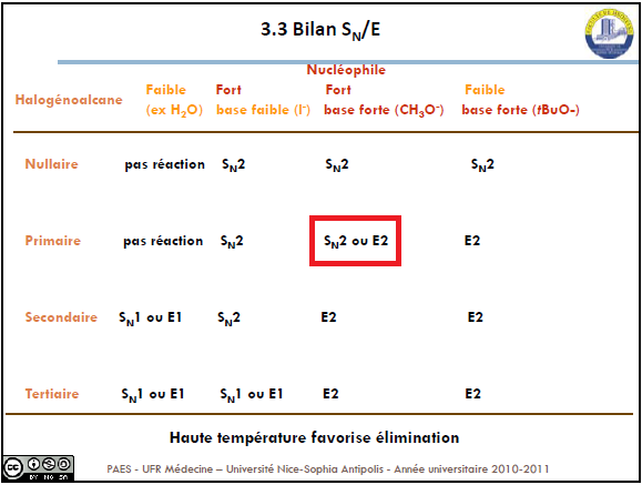 Donc Base forte = E2 SAUF si carbone primaire, avec excellent nucléophile (en plus d'être une base forte) et en absence de chauffage.