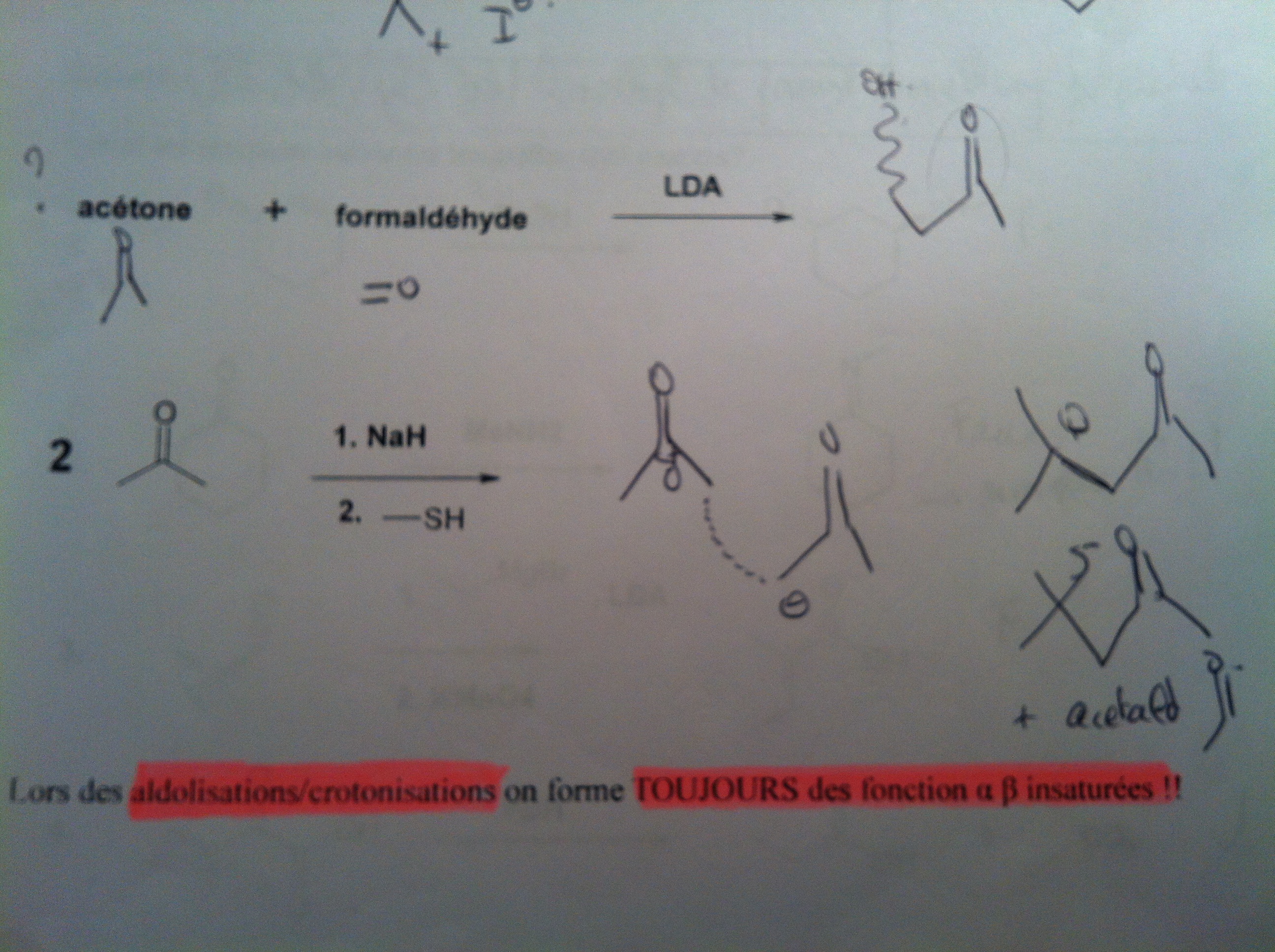 • La base forte déprotonne en alpha (donc maintenant tu sais que c'est grâce à la forme mésomère énolate que la déprotonnation, spécifiquement ici, implique).