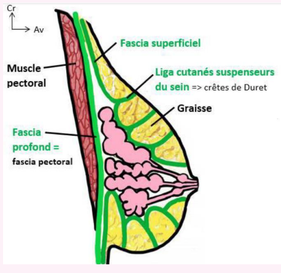 "Le fascia superficiel [...] va former une chaussette ligamentaire à la glande et [...] est caractéristique par ses ligaments cutanés qui vont s’amarrer à la peau du sein formant les ligaments suspenseurs du sein".