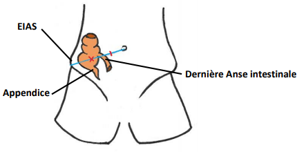 Le point de McBurney c'est un point qui se trouve entre le 1/3 externe et le 1/3 moyen du segment qui relie l'épine iliaque antéro-supérieure à l'ombilic. C'est ici que se projette les dernières anses intestinales, la jonction iléo-caecale, ainsi que l'appendice et le caecum.