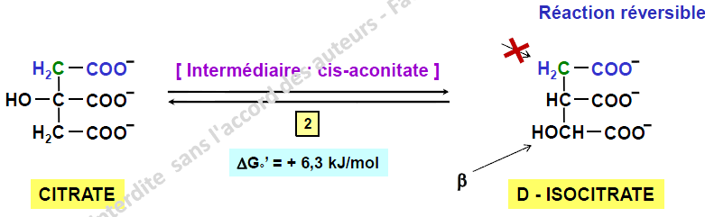 2ème réaction du ck : ∆G'0 légerement positif mais la réaction est réversible donc le ∆G' est forcément proche de zéro (ce sont les concentrations de citrate et d'isocitrate qui décidentVoilà, c'est encore mieux avec les formules (on se rend mieux compte des choses) mais je ne voulais pas surcharger mon message déjà chargé