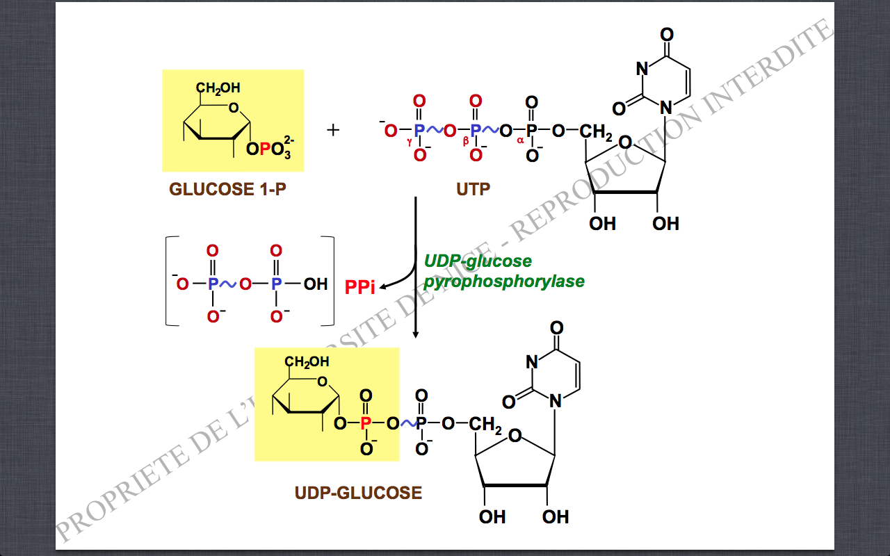 Autrement dit un Pyrophosphate se détache de l'UTP (il est ensuite hydrolysé en 2 Pi), il reste un UMP. Cet UMP se fixe au G1P : le phosphate de l'UMP se lie par une liaison phospho-anhydre au phosphate du G1P... Du coup on obtient un UDP-Glucose (l'UDP contient un phosphate provenant de l'UMP et un phosphate provenant du G1P)