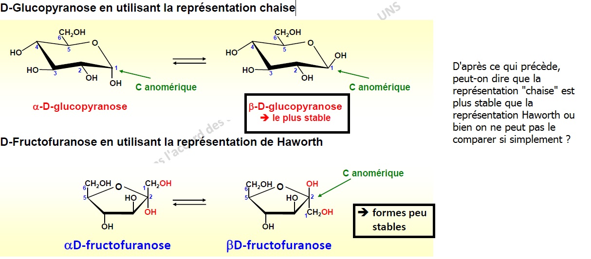 En fait, ce n'est pas qu'une simple représentation, c'est la vrai forme que prend la molécule dans l'espace, et la conformation chaise est beaucoup plus stable que la conformation Haworth car beaucoup moins d'encombrement stérique